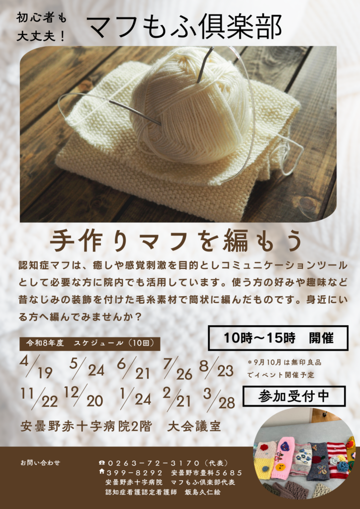 安曇野赤十字病院では認知症ケアの一環として、手作りマフを制作する「マフもふ倶楽部」を開催しています!現在、一緒にマフを編んでくださる参加者を募集中です。初心者の方も大歓迎ですのでお気軽にご参加ください!